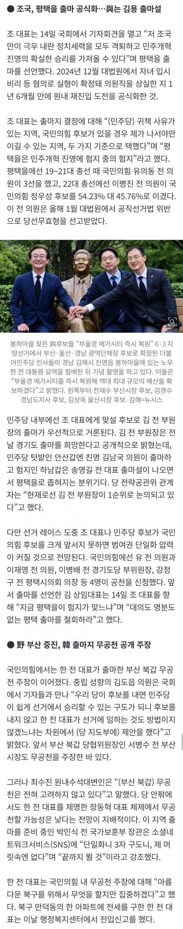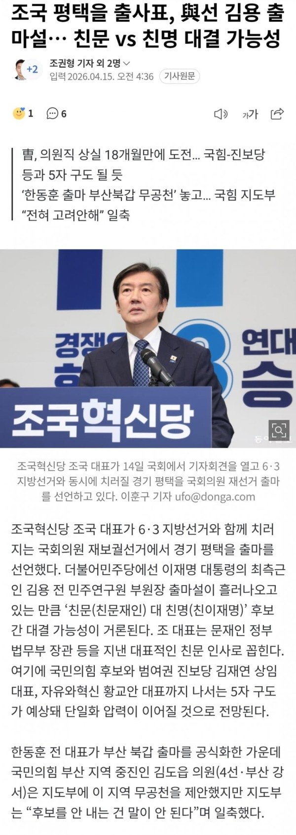 조국혁신당 조국 대표가 6·3 지방선거와 함께 치러지는 국회의원 재보궐선거에서 경기 평택을 출마를 선언했다. 더불어민주당에선 이재명 대통령의 최측근인 김용 전 민주연구원 부원장 출마설이 흘러나오고 있는 만큼 ‘친문(