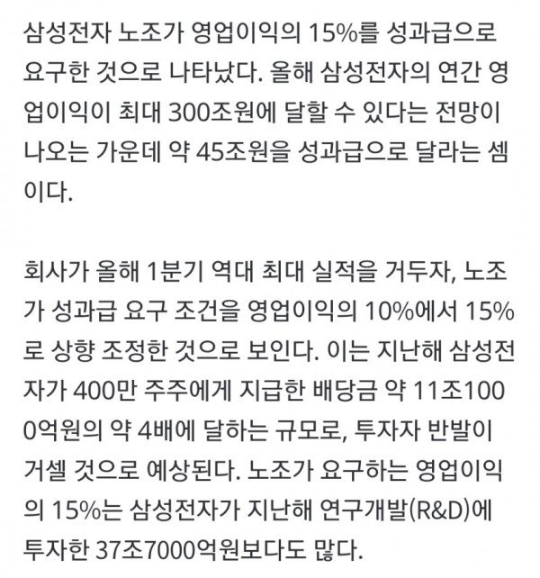 삼성전자 노조 “영업이익 15% 성과급으로 달라”…40조원 요구에 주주