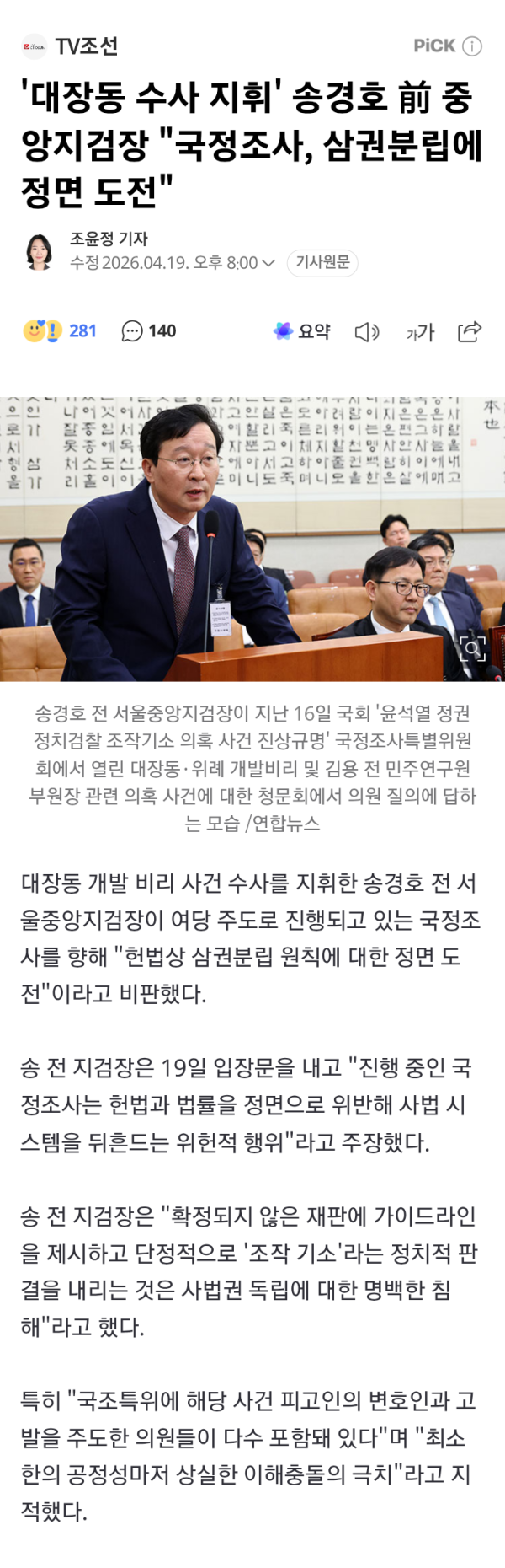 대장동 개발 비리 사건 수사를 지휘한 송경호 전 서울중앙지검장이 여당 주도로 진행되고 있는 국정조사를 향해 "헌법상 삼권분립 원칙에 대한 정면 도전"이라고 비판했다. 송 전 지검장은 19일 입장문을 내고 "진행 중인