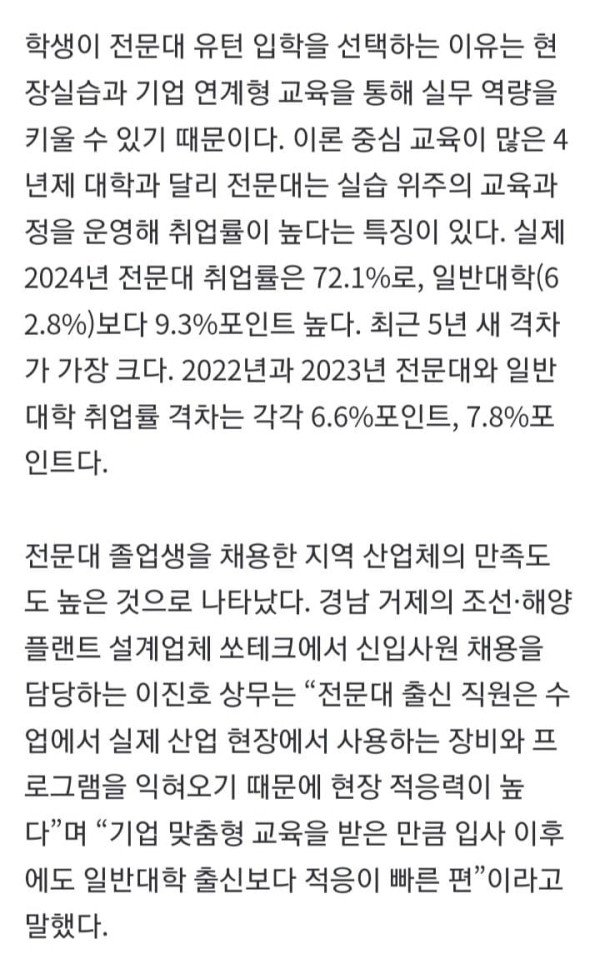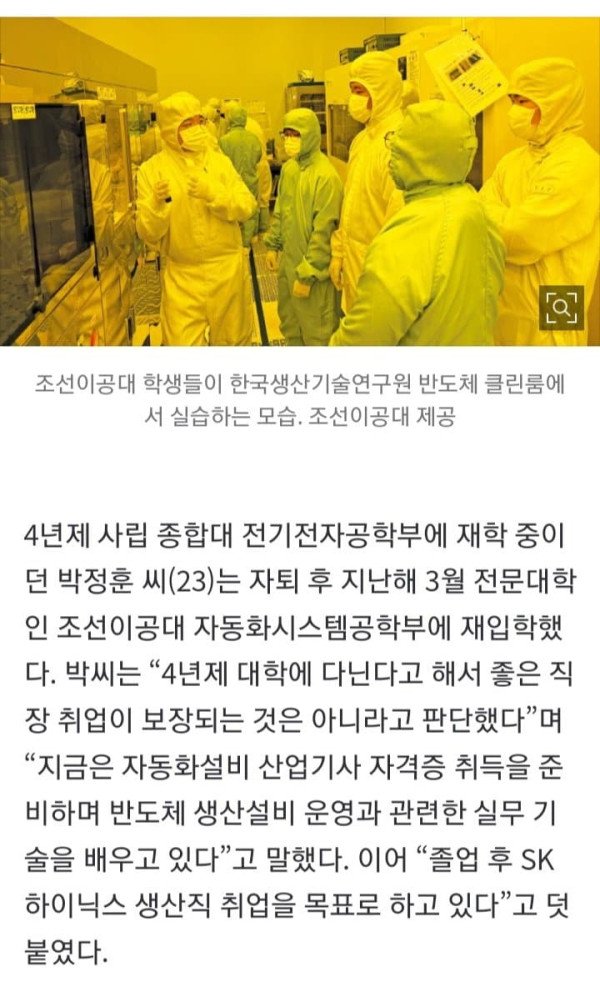 4년제 사립 종합대 전기전자공학부에 재학 중이던 박정훈 씨(23)는 자퇴 후 지난해 3월 전문대학인 조선이공대 자동화시스템공학부에 재입학했다. 박씨는 “4년제 대학에 다닌다고 해서 좋은 직장 취업이 보장되는 것은 아