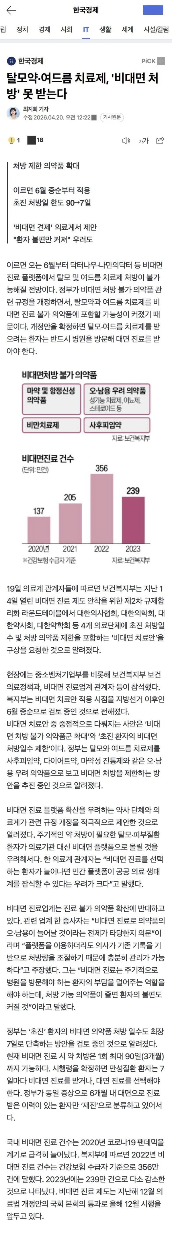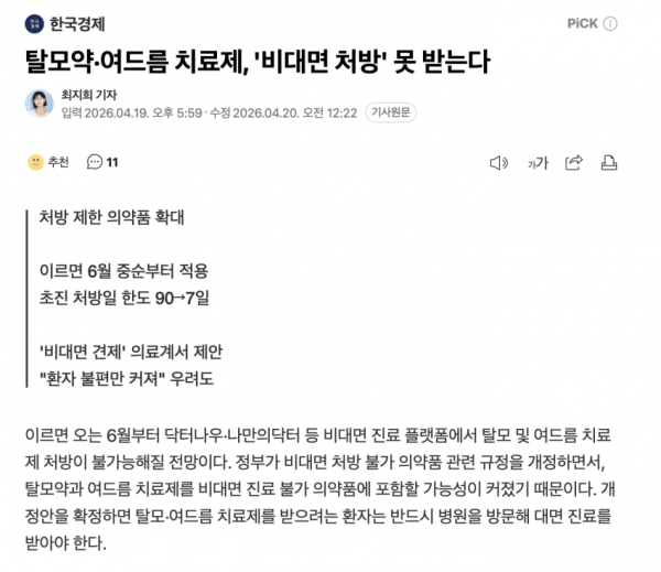 이르면 오는 6월부터 닥터나우·나만의닥터 등 비대면 진료 플랫폼에서 탈모 및 여드름 치료제 처방이 불가능해질 전망이다. 정부가 비대면 처방 불가 의약품 관련 규정을 개정하면서, 탈모약과 여드름 치료제를 비대면 진료