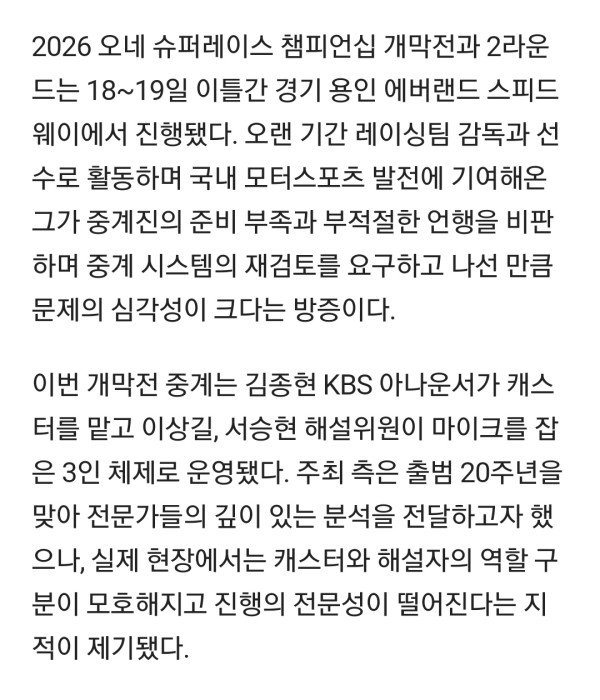 김진표, CJ 슈퍼레이스 중계진에 쓴소리