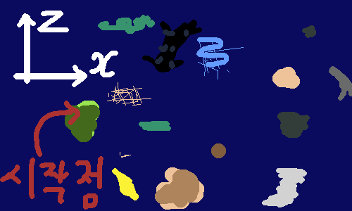 이 게임은 x,z축이 가로 세로이고 높이는 y축이다. 처음에 게임을 시작하면 y축이 0에 가깝고 xz어디로 가든 뭔가 항상 나오며 분위기도 편안하고 잔잔하다