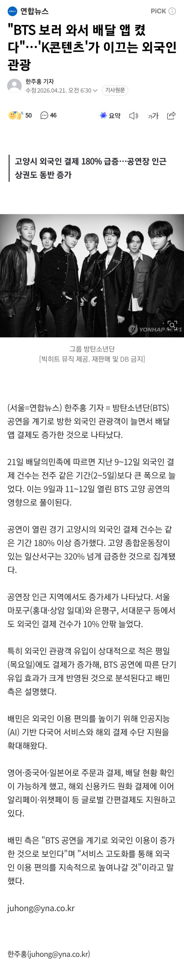 고양시 외국인 결제 180% 급증…공연장 인근 상권도 동반 증가 방탄소년단(BTS) 공연을 계기로 방한 외국인 관광객이 늘면서 배달앱 결제도 증가한 것으로 나타났다. 21일 배달의민족에 따르면 지난 9∼12일 외국인