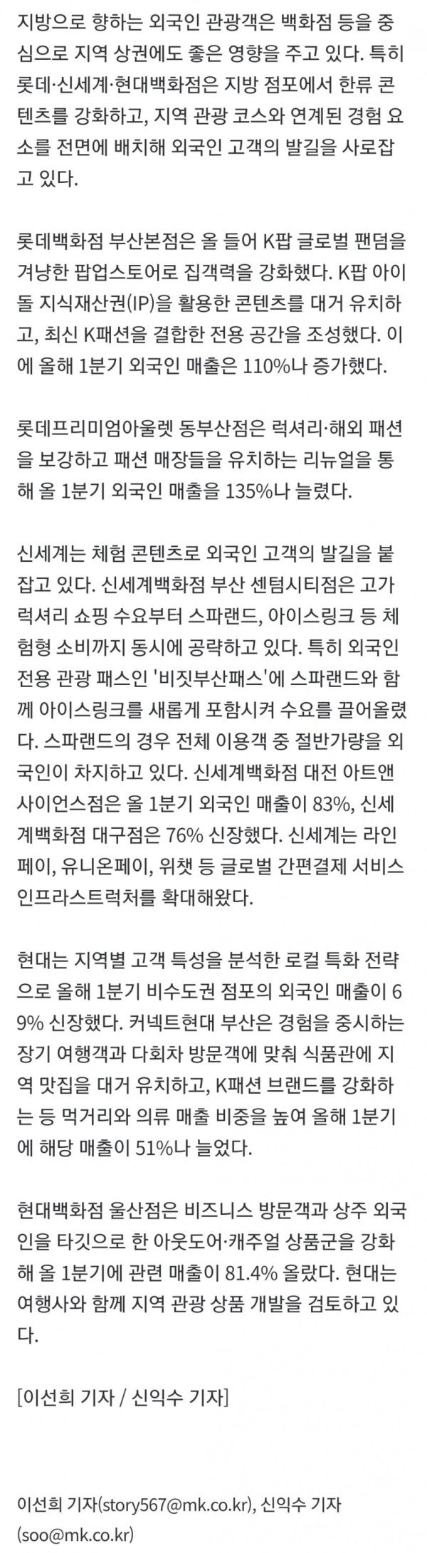서울 밖으로 확산하는 K바이브 한국 'N차 여행' 외국인 늘며 지역공항 입국 외국인 50% 쑥 지방 백화점 외국인매출 급증 롯데 부산·신세계 대전 2배로 백화점, K팝 체험매장 등 확대 결제 인프라 등 편의성 강화도