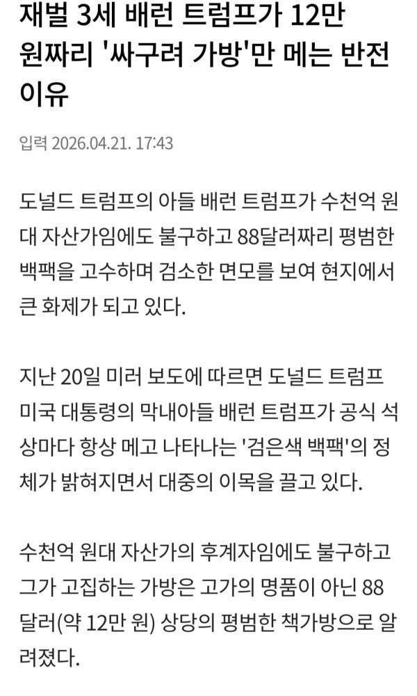 배런 트럼프가 12만 원짜리 '싸구려 가방'만 메는 반전 이유