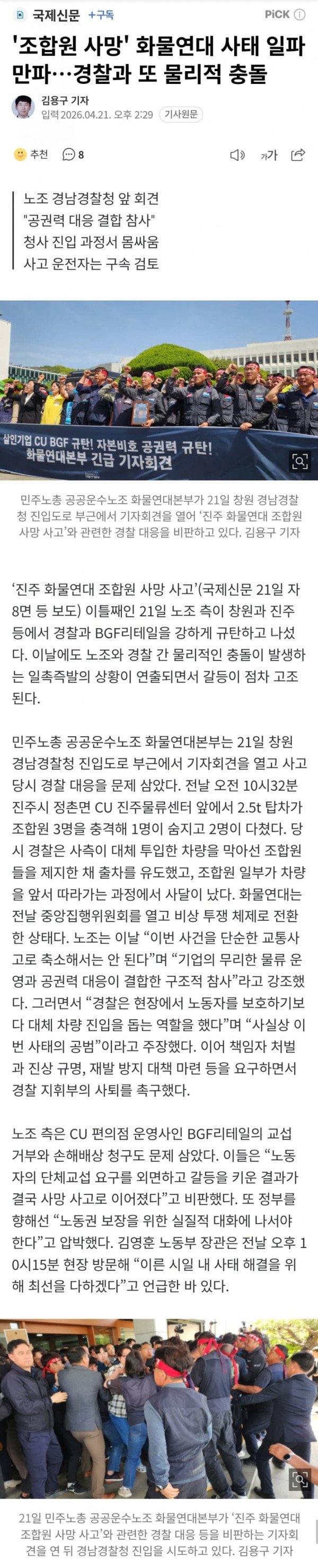 ‘진주 화물연대 조합원 사망 사고’(국제신문 21일 자 8면 등 보도) 이틀째인 21일 노조 측이 창원과 진주 등에서 경찰과 BGF리테일을 강하게 규탄하고 나섰다. 이날에도 노조와 경찰 간 물리적인 충돌이 발생하는