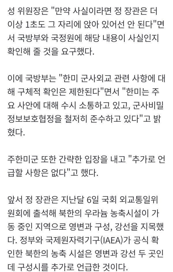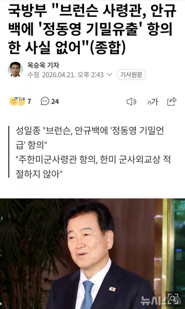 국방부는 21일 북한 구성 핵시설을 언급한 정동영 통일부 장관의 기밀 유출 논란과 관련해 제이비어 브런슨 주한미군사령관이 안규백 장관에게 항의했다는 정치권 주장에 대해 사실이 아니라고 반박했다. 국방부는 이날 오후