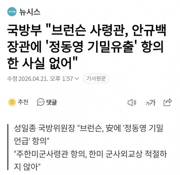 국방부 "브런슨 사령관, 안규백 장관에 '정동영 기밀유출' 항의한 사실 없어"