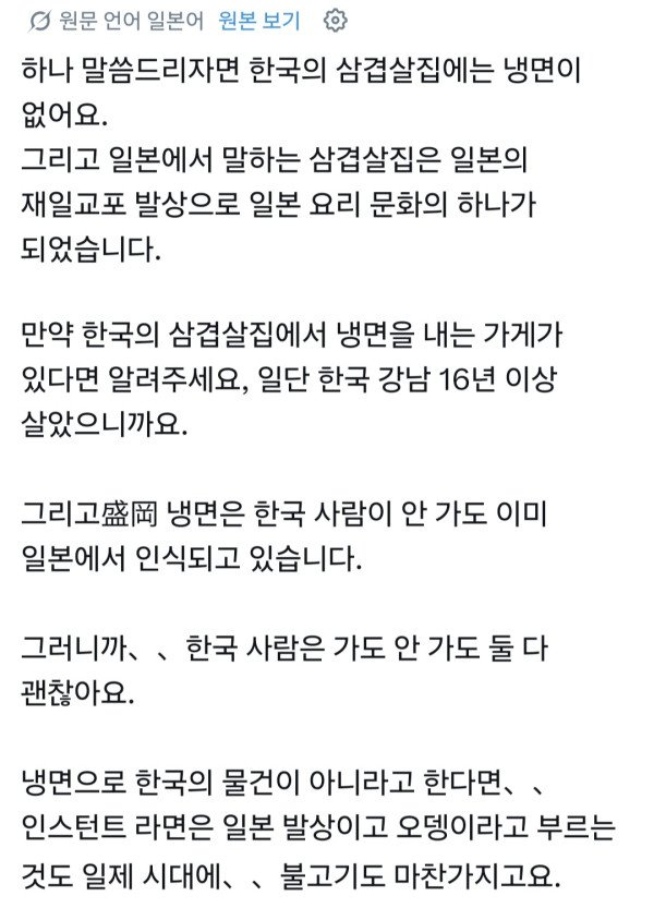 한국 삼겹살 집에는 냉면이 없다는 일본인