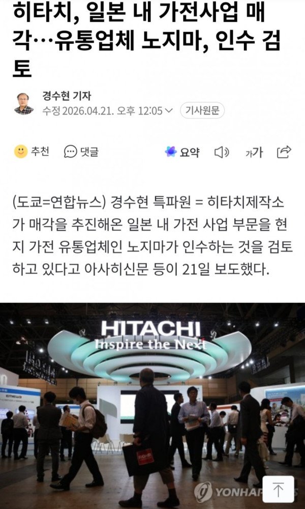 일본 가전판매 대기업 노지마가 히타치 가전사업 인수하는걸로 협의 봤다고 함