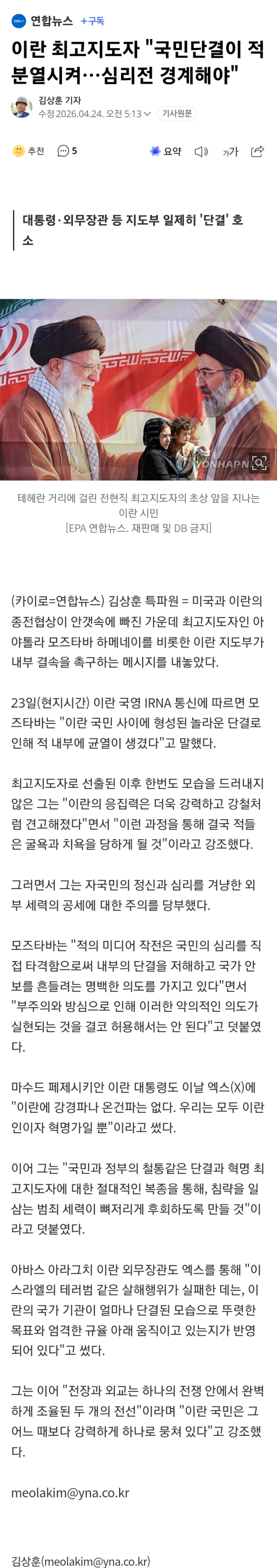 대통령·외무장관 등 지도부 일제히 '단결' 호소 김상훈 특파원 = 미국과 이란의 종전협상이 안갯속에 빠진 가운데 최고지도자인 아야톨라 모즈타바 하메네이를 비롯한 이란 지도부가 내부 결속을 촉구하는 메시지를 내놓았다.