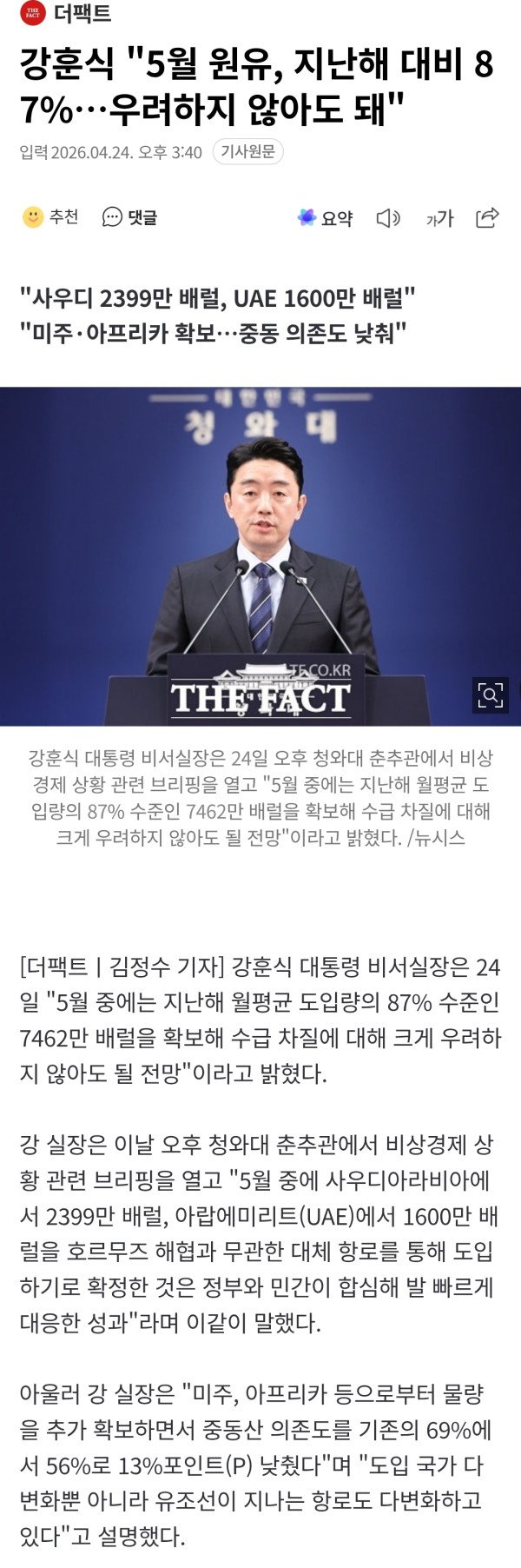 "사우디 2399만 배럴, UAE 1600만 배럴" "미주·아프리카 확보…중동 의존도 낮춰" 강훈식 대통령 비서실장은 24일 "5월 중에는 지난해 월평균 도입량의 87% 수준인 7462만 배럴을 확보해 수급 차질에