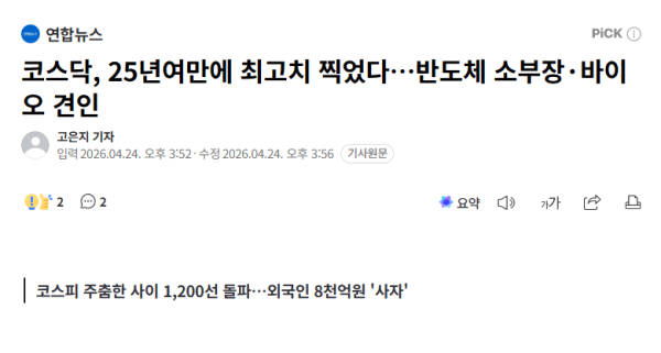 코스피 주춤한 사이 1,200선 돌파…외국인 8천억원 '사자' 코스닥이 24일 1,200선을 돌파하며 25년여 만에 최고치를 기록했다. 코스피가 사상 최고가 랠리를 이어가는 가운데 그간 상대적으로 속도가 느렸던 코스