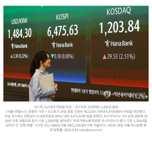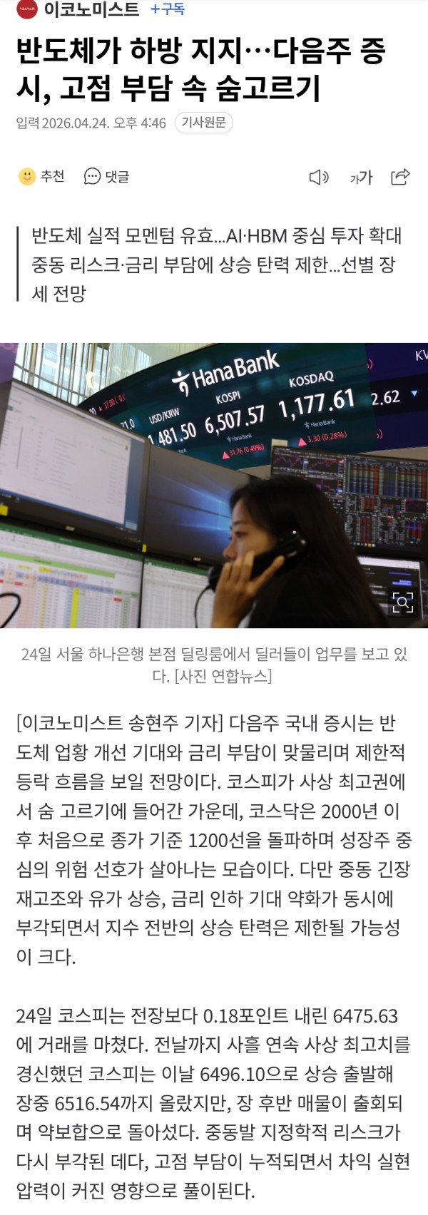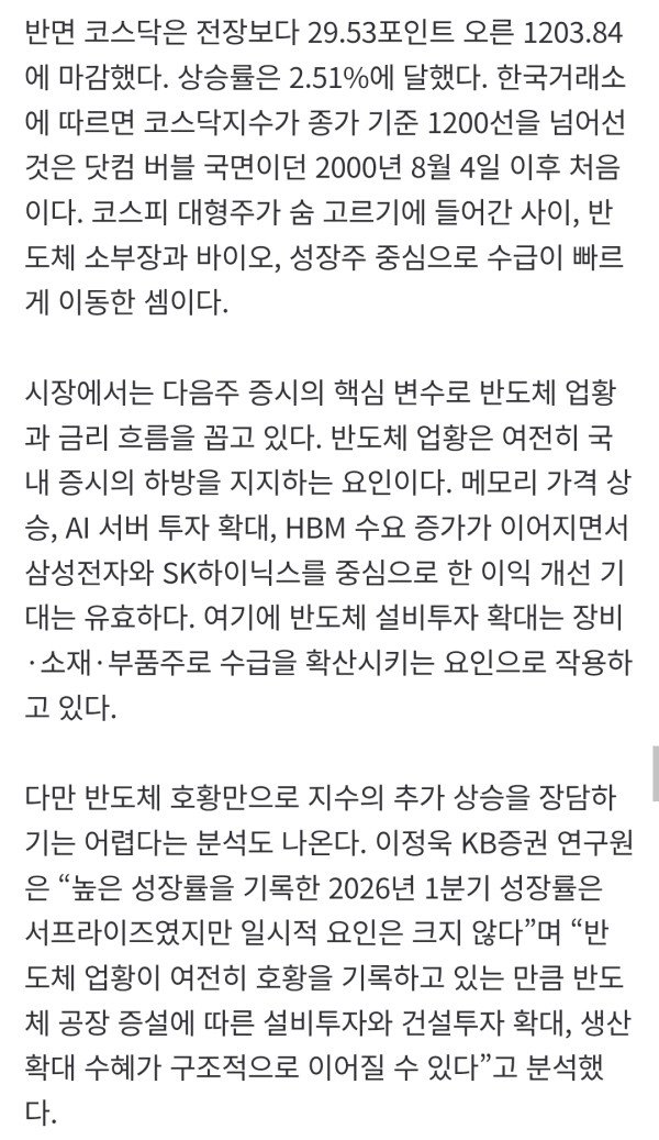 다음주 국내 증시는 반도체 업황 개선 기대와 금리 부담이 맞물리며 제한적 등락 흐름을 보일 전망이다. 코스피가 사상 최고권에서 숨 고르기에 들어간 가운데, 코스닥은 2000년 이후 처음으로 종가 기준 1200선을 돌