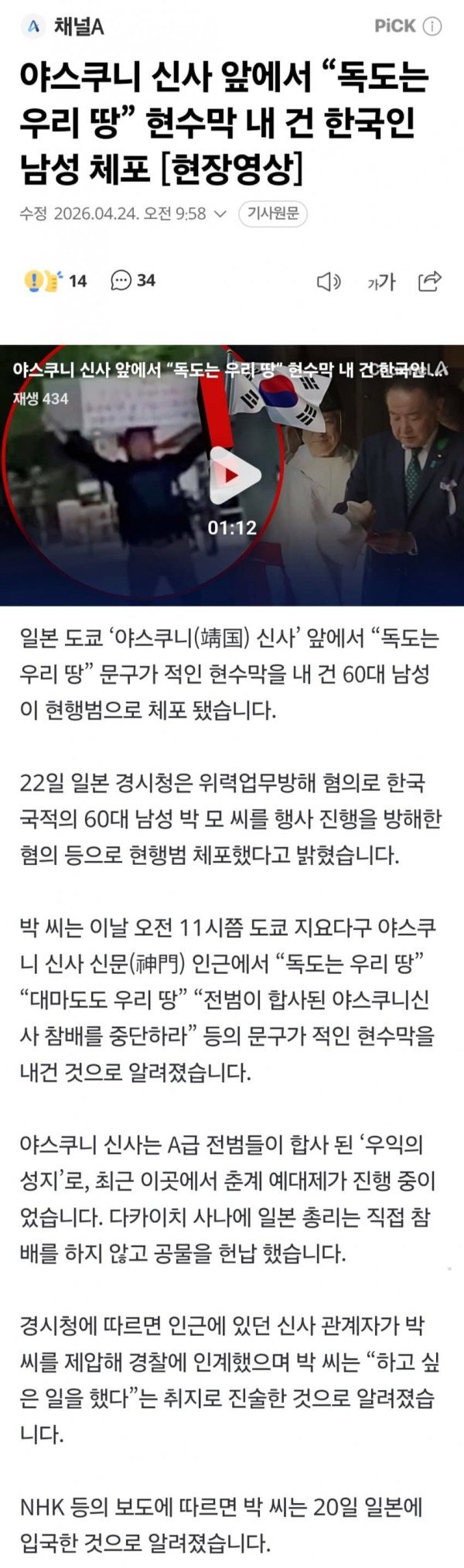 일본 야스쿠니 신사에서 '독도는 우리 땅'이라고 쓴 현수막을 든 한국인 남성이 체포됐습니다.NHK 보도에 따르면 어제(22일) 춘계 예대제(例大祭·제사)가 진행 중인 일본 야스쿠니 신사에서 '독도는 우리 땅'이라고 쓴 현수막을 든 한국인 남성이 업무 방해 혐의로 체포됐습니다.60대...