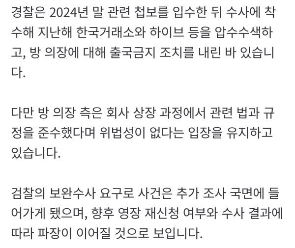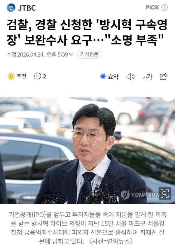 검찰이 기업공개(IPO) 과정에서 투자자를 속였다는 의혹을 받는 하이브 방시혁 의장에 대한 구속영장에 제동을 걸었습니다. 서울남부지검 금융·증권범죄합동수사부는 오늘(24일) 공지를 통해 "서울시경이 2600억 원대