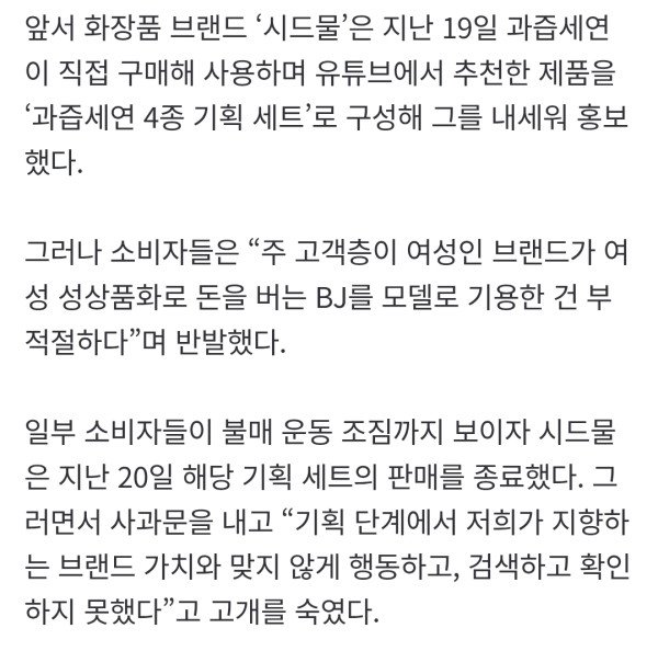 한 유명 화장품 브랜드가 유명 여성 BJ(인터넷 방송인) 과즙세연(25·본명 인세연)을 광고 모델로 기용했다 여성 소비자들의 반발에 취소한 것을 둘러싸고 여성단체가 반대 성명을 냈다. 소비자들은 과즙세연이 인터넷 플
