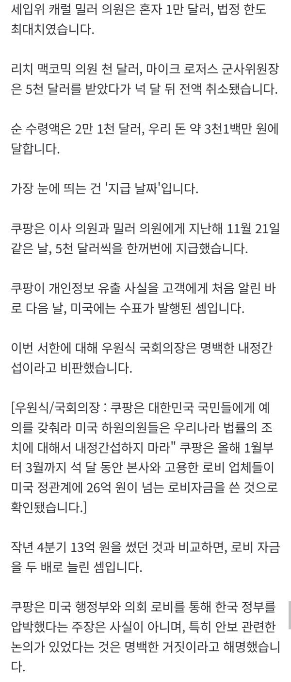 이에 대해 쿠팡은 미국 행정부와 의회에 로비해 한국 정부를 압박했단 건 사실이 아니라며, 특히 안보 관련 논의를 했단 주장은 명백한 거짓이라고 강조했습니다.