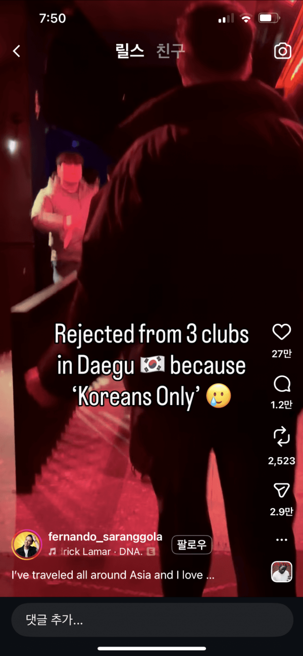 어느 외국인이 대구에서 입장 거부 당했다고 함.