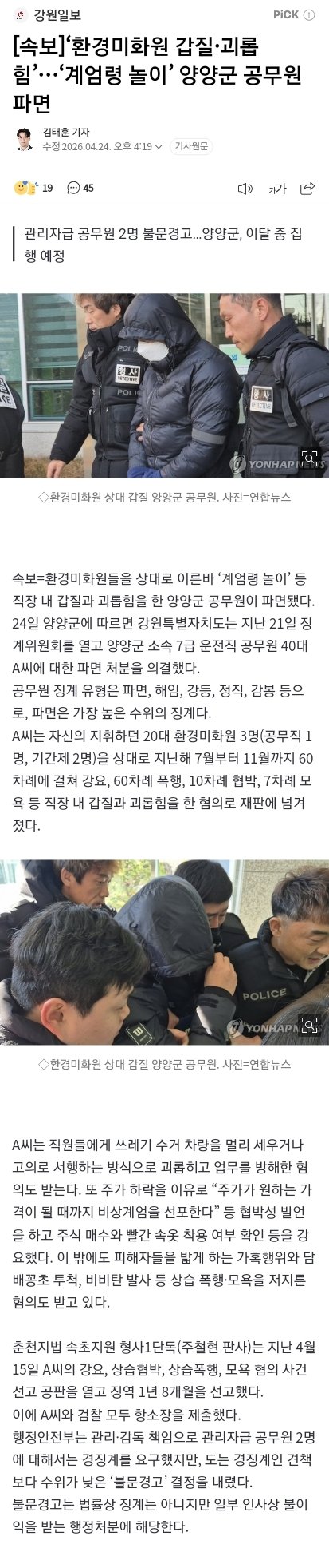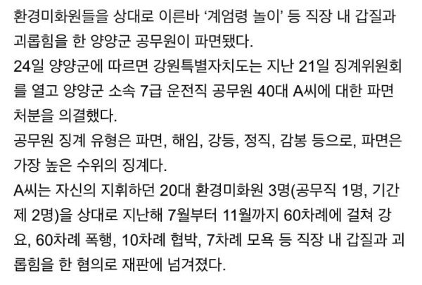 [속보]‘환경미화원 갑질·괴롭힘’‘계엄령 놀이’ 양양군 공무원 파면