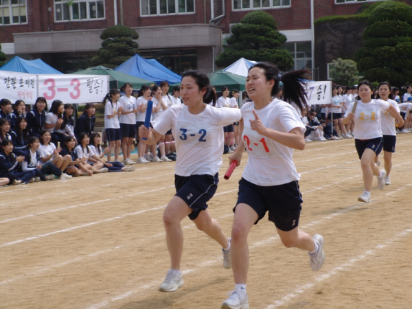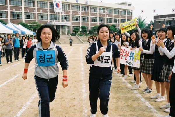 운동회 날 계주 경기 중, 두 명의 남학생이 전력으로 달리고 있고 여학생들이 보면서 응원 중