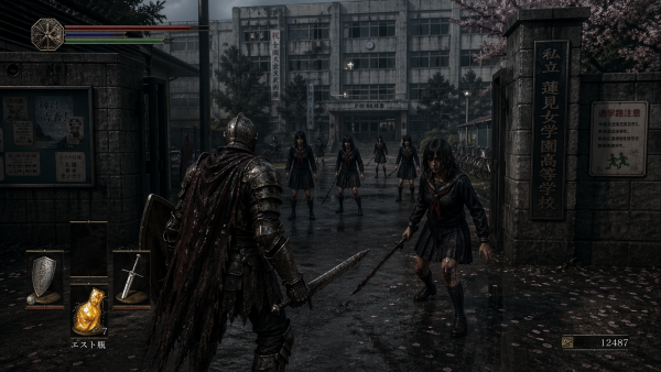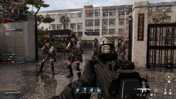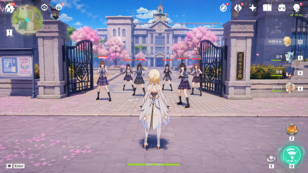 프롬프트 : ㅇㅇㅇ 게임 그래픽인데 여학교 배경으로 스크린샷 만들어줘. UI 다 ㅇㅇㅇ와 같은데 배경만 여학교에 앞에 서있는 적들도 여학생들