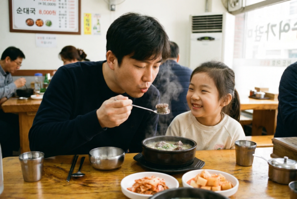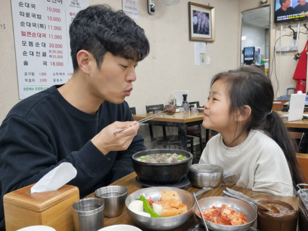 순대국 집에서 30대정도 된 아빠가 7살 딸에게 순대를 주기 위해 입바람으로 불어서 식혀주고 있음