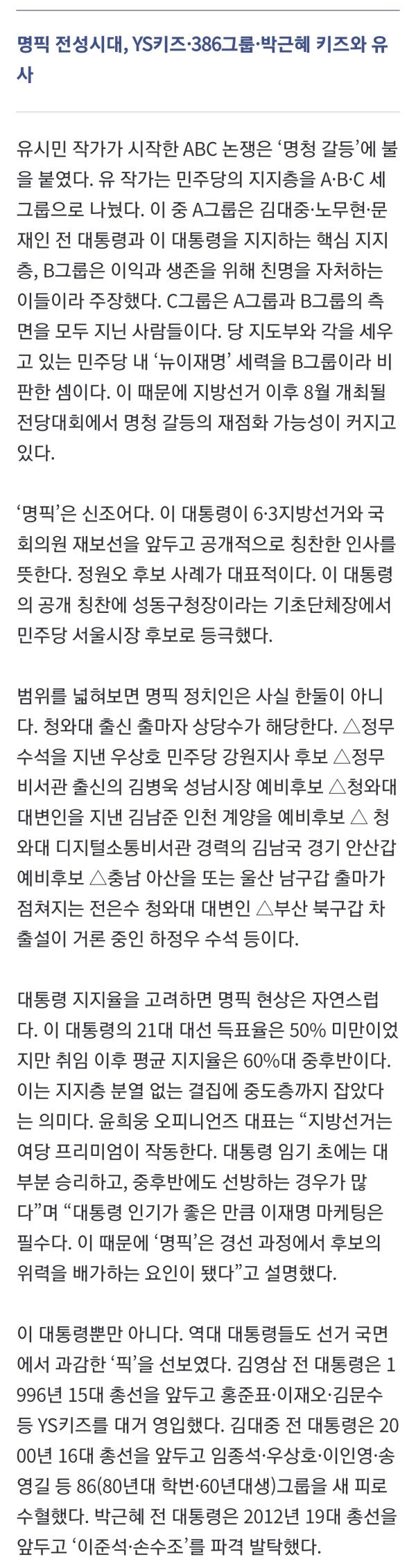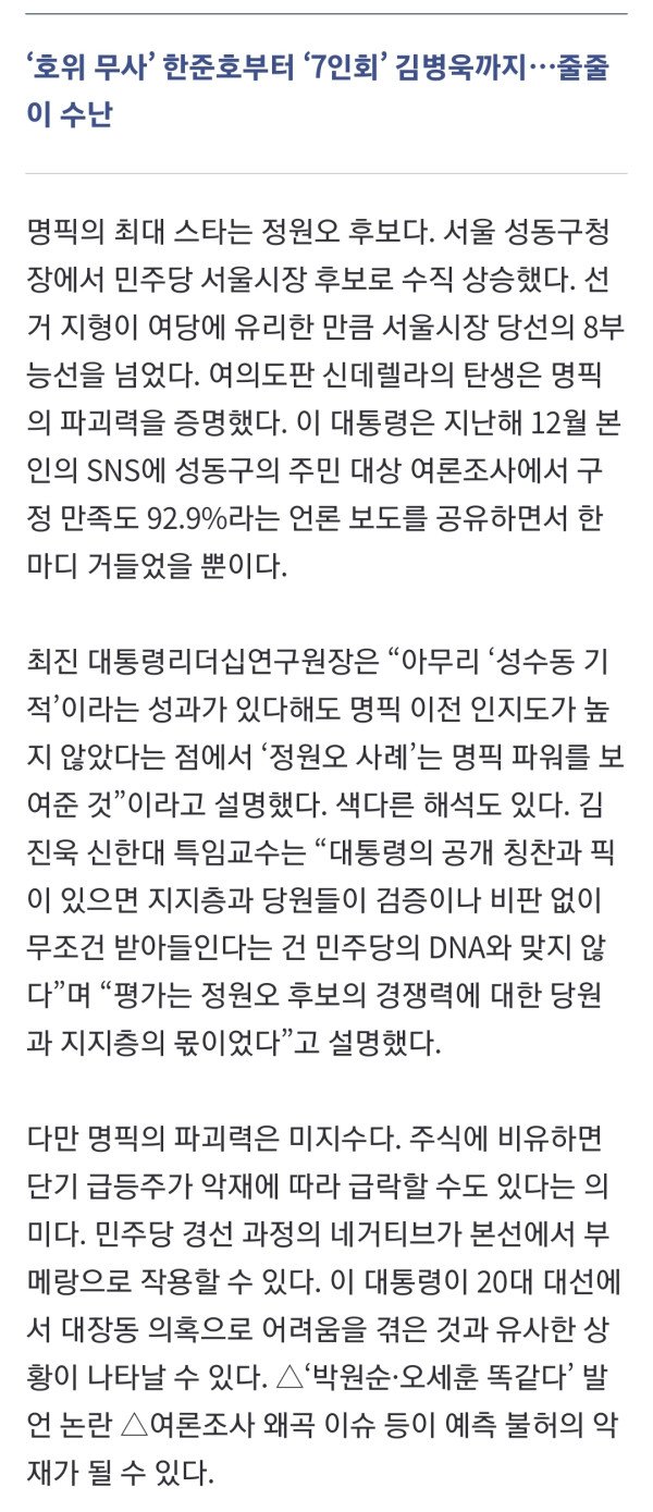 6·3지방선거 ‘명픽’ 수난사 = 8월 전대 ‘명청 갈등’ 예고편 ● 대통령 지지율 고공 행진에도 ‘명픽’ 후보, 경선 고전 ● 정원오, 경선 승리했지만 네거티브 후유증 남아 ● 한준호는 경선 탈락, 김병욱은 단수공