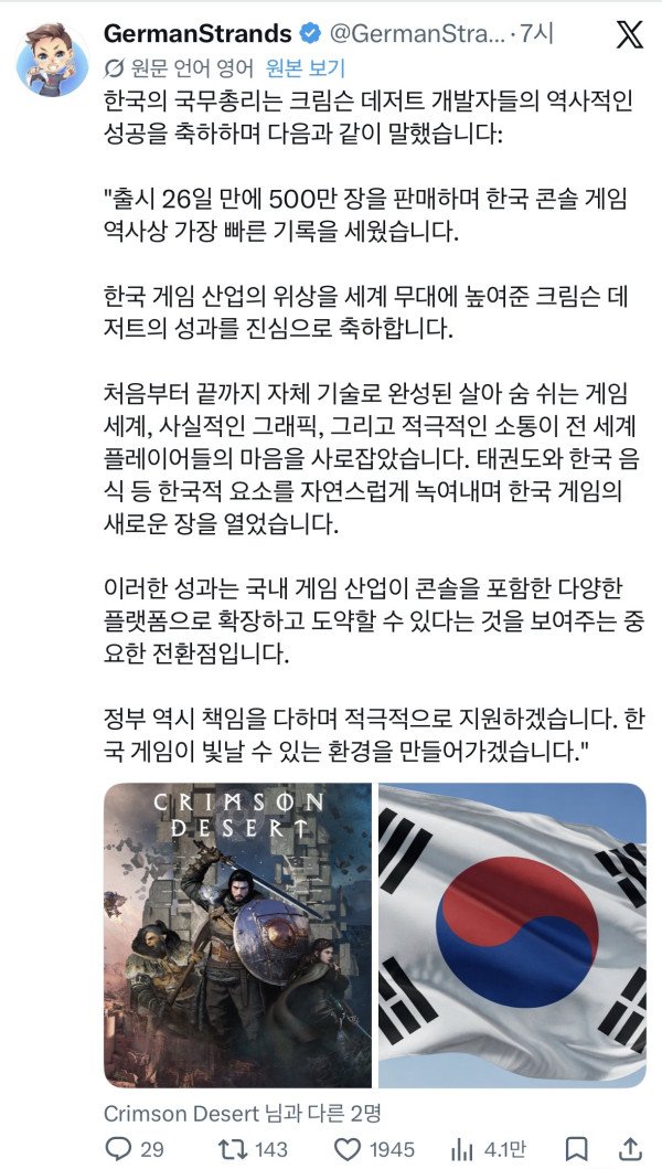 국무총리가 붉은사막에 축하인사 보냈었구나