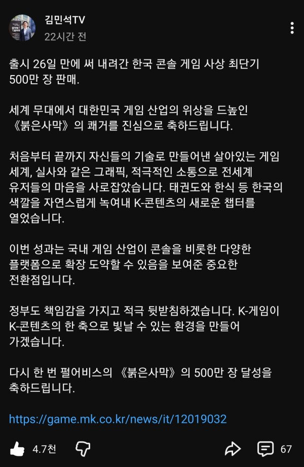 김민석 총리 "붉은사막 500만장 쾌거, K-콘텐츠의 새로운 챕터 열었다