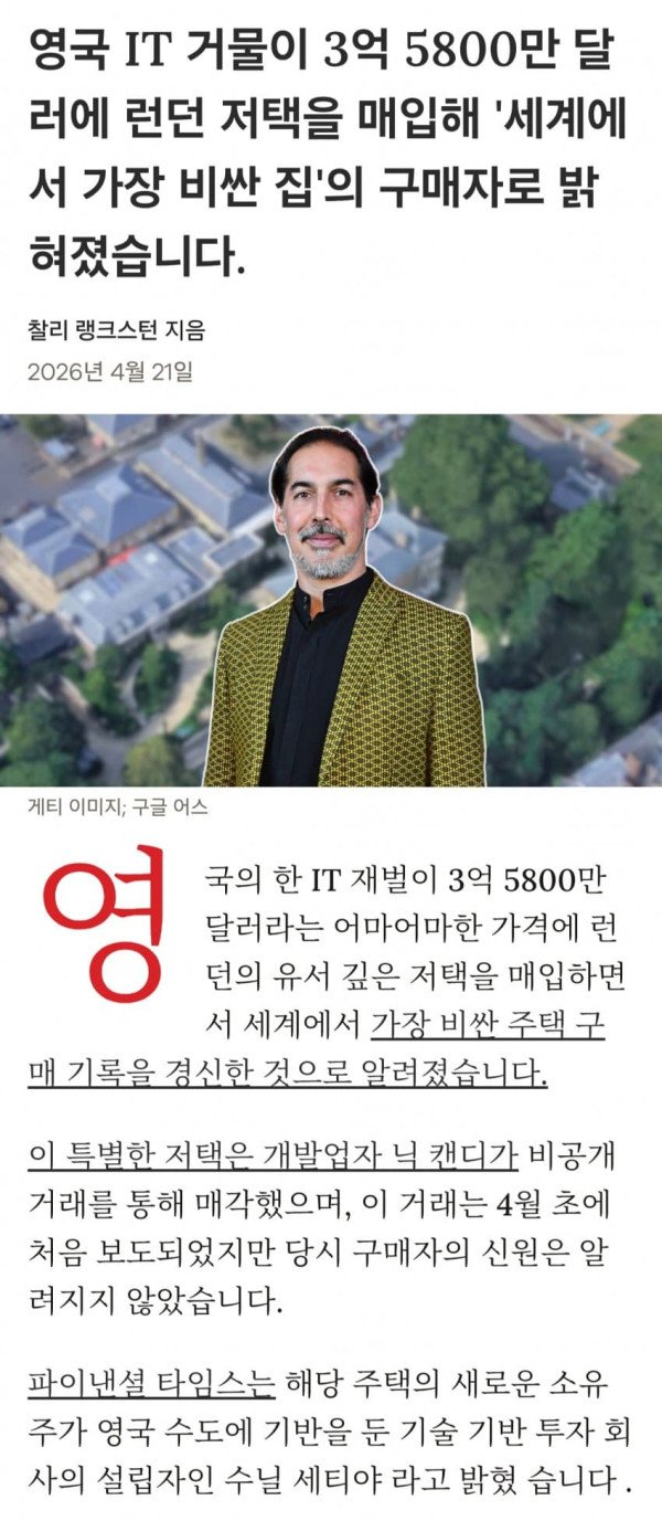 최근 영국의 한 테크 억만장자가 2억 7000만파운드, 한국돈 무려 5300억원에 달하는 돈을 주고 런던 첼시에 위치한 저택을 구매해서 충격을 준 바가 있다.