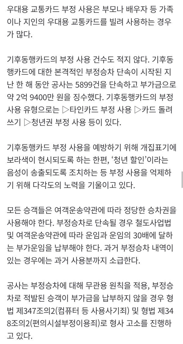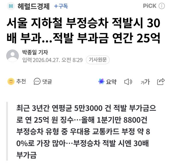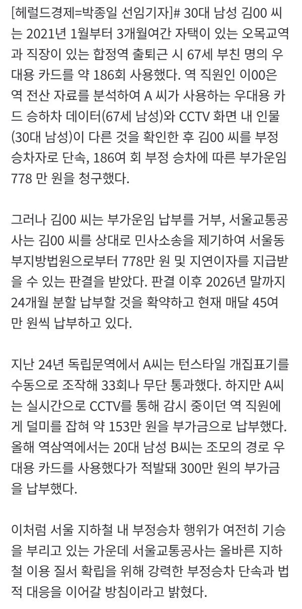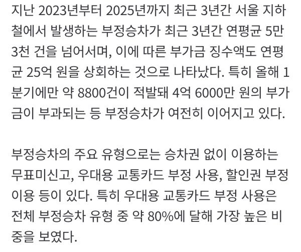최근 3년간 연평균 5만3000 건 적발 부가금으로 연 25억 원 징수…올해 1분기만 8800건 부정승차 유형 중 우대용 교통카드 부정 약 80%로 가장 많아…부정승차 적발 시엔 30배 부가금 지하철 [헤럴드경제=박