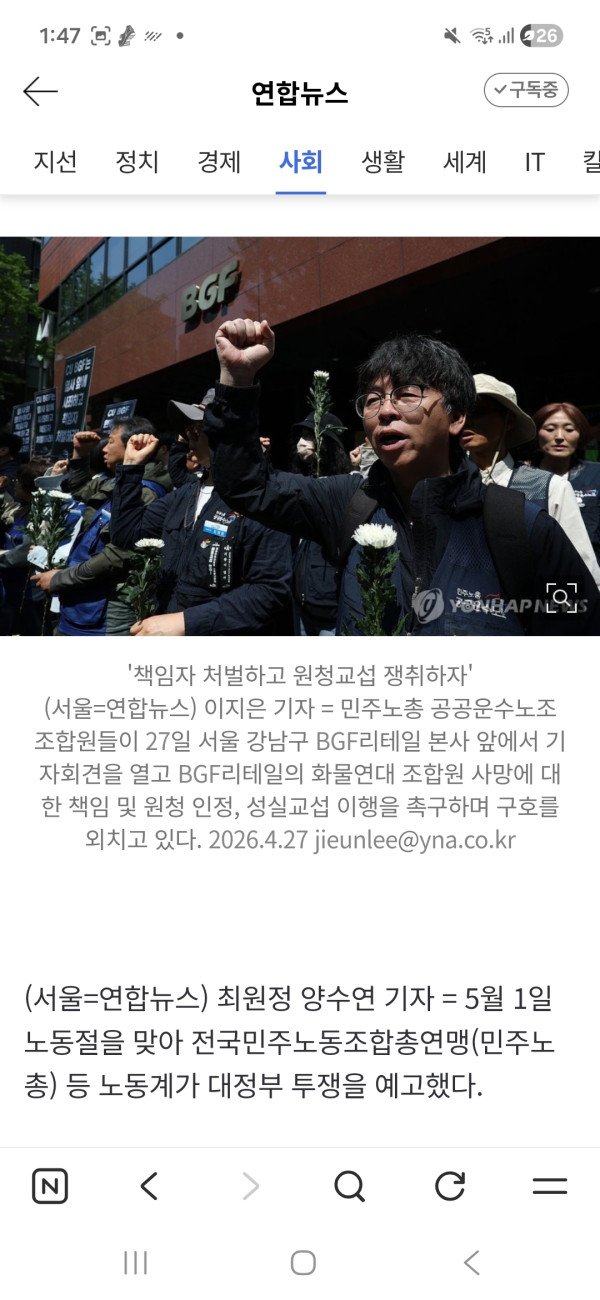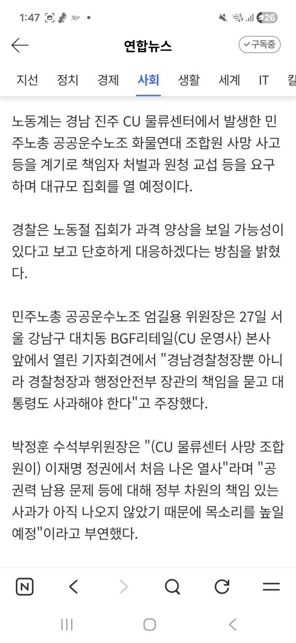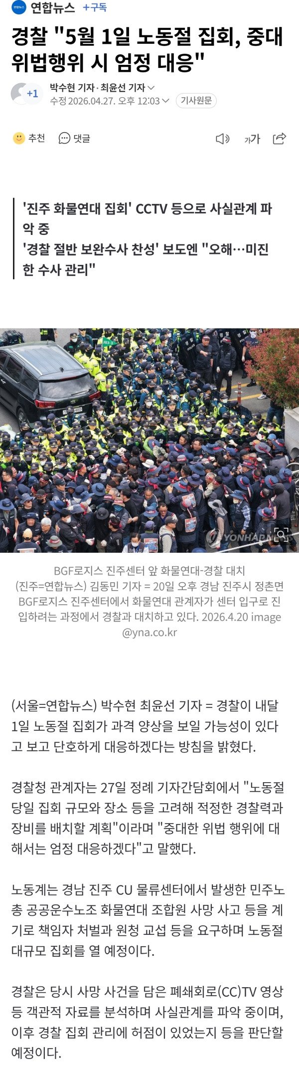 '진주 화물연대 집회' CCTV 등으로 사실관계 파악 중 '경찰 절반 보완수사 찬성' 보도엔 "오해…미진한 수사 관리" 박수현 최윤선 기자 = 경찰이 내달 1일 노동절 집회가 과격 양상을 보일 가능성이 있다고 보고