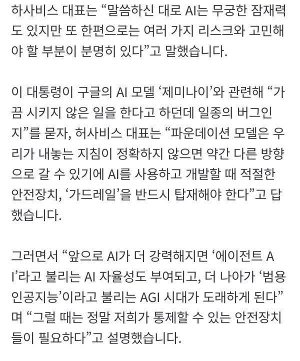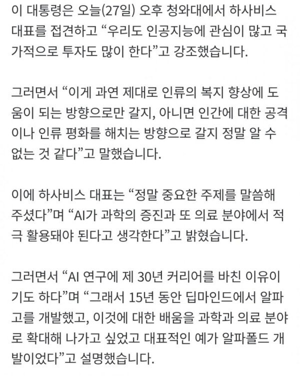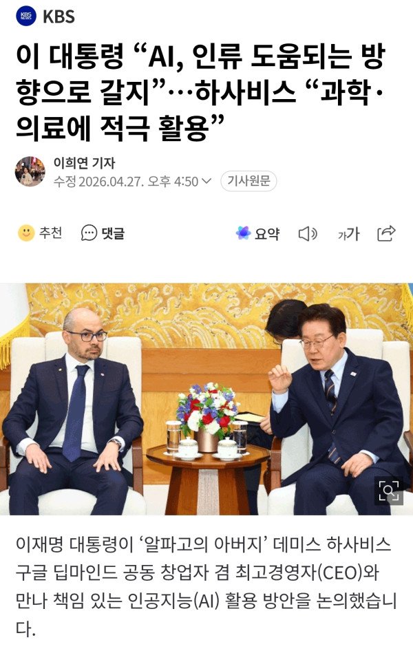 이재명 대통령이 ‘알파고의 아버지’ 데미스 하사비스 구글 딥마인드 공동 창업자 겸 최고경영자(CEO)와 만나 책임 있는 인공지능(AI) 활용 방안을 논의했습니다. 이 대통령은 오늘(27일) 오후 청와대에서 하사비스