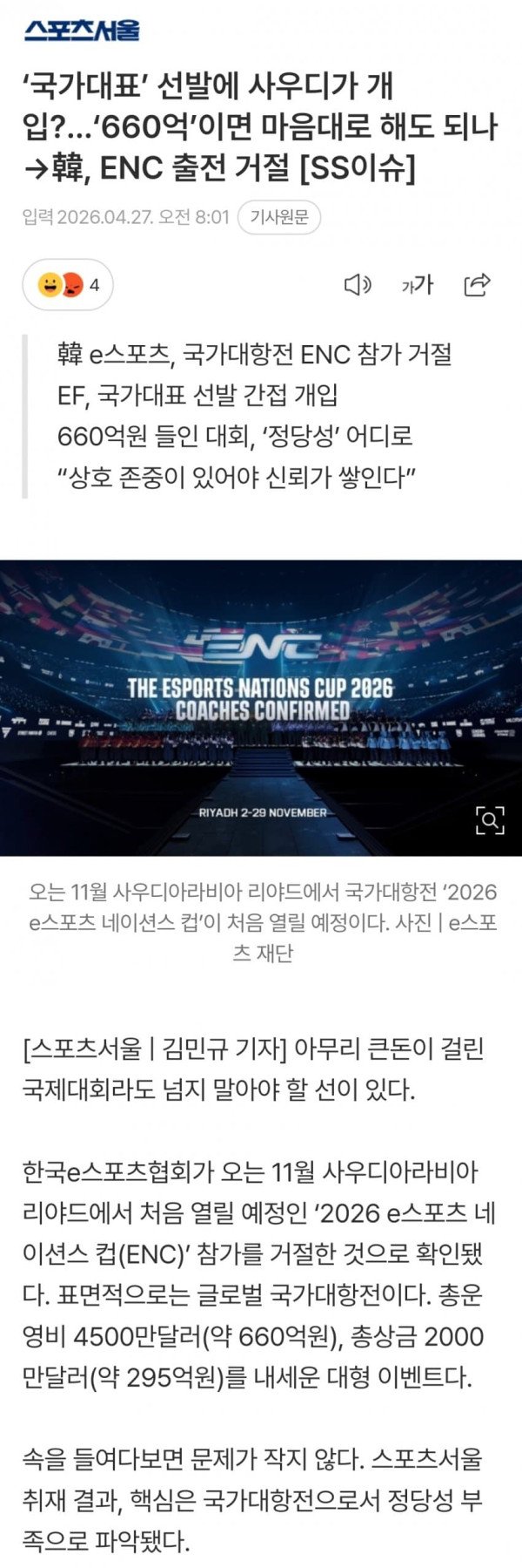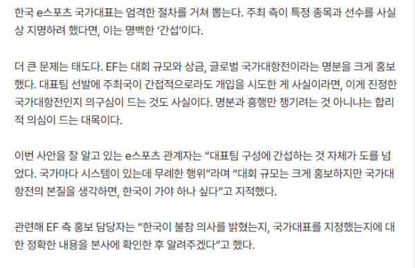 韓 e스포츠, 국가대항전 ENC 참가 거절 EF, 국가대표 선발 간접 개입 660억원 들인 대회, ‘정당성’ 어디로 “상호 존중이 있어야 신뢰가 쌓인다” [스포츠서울 | 김민규 기자] 아무리 큰돈이 걸린 국제대회라도 넘지 말아야 할 선이 있다. 한국e스포츠협회가 오는 11월 사우디아