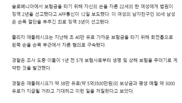 5억원이 즉시 지급되는 총 12억원짜리 보험들고 자기 왼손 짜름