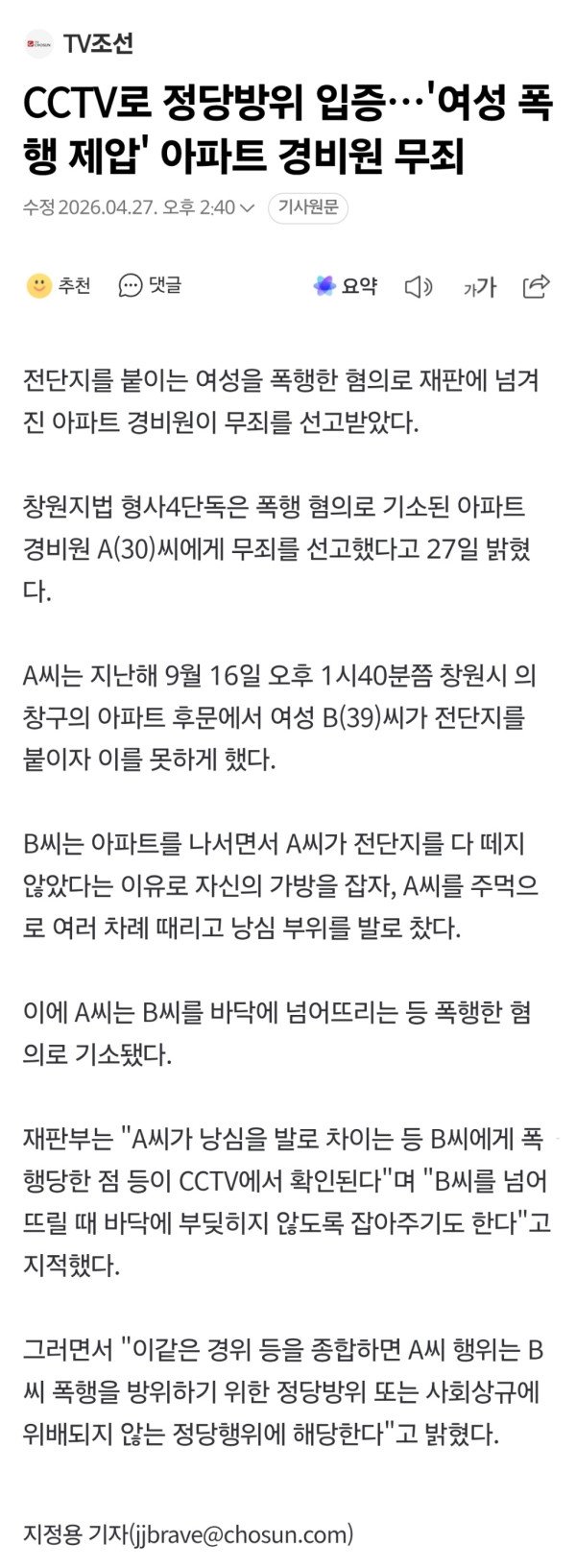 재판부 "폭행 방위하기 위한 정당방위 또는 정당행위에 해당" 전단지를 붙이는 여성을 폭행한 혐의로 재판에 넘겨진 아파트 경비원이 무죄를 선고받았다. 창원지법 형사4단독 석동우 판사는 폭행 혐의로 기소된 아파트 경비원