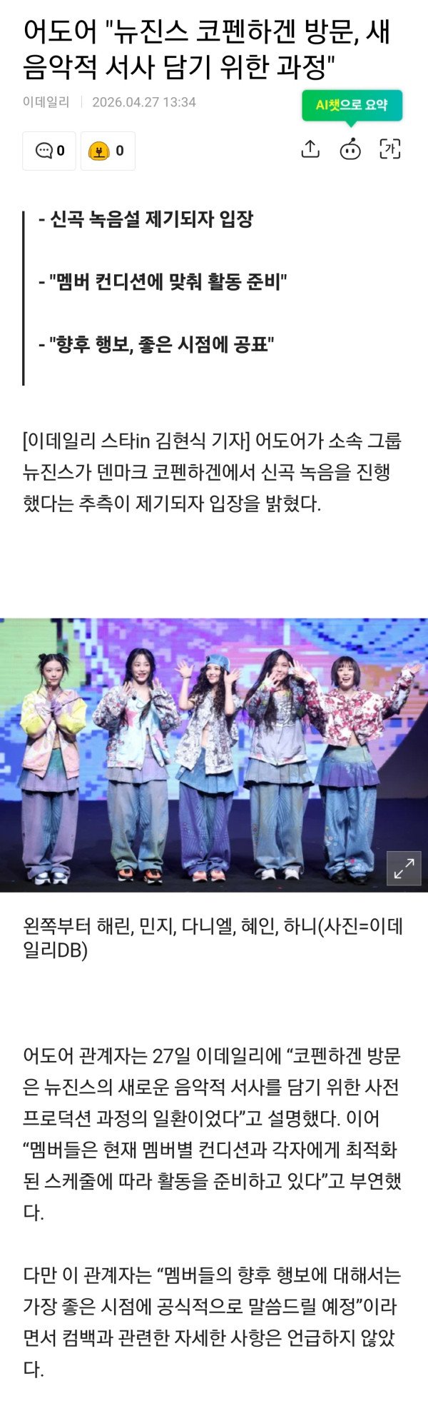 뉴진스 해린·혜인·하니 뭉쳤다…소속사 어도어 "함께 덴마크 방문"