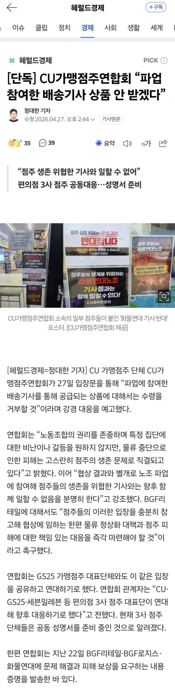 [단독] CU가맹점주연합회 “파업 참여한 배송기사 상품 안 받겠다”