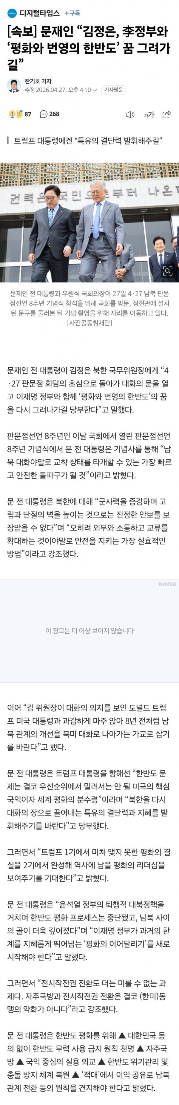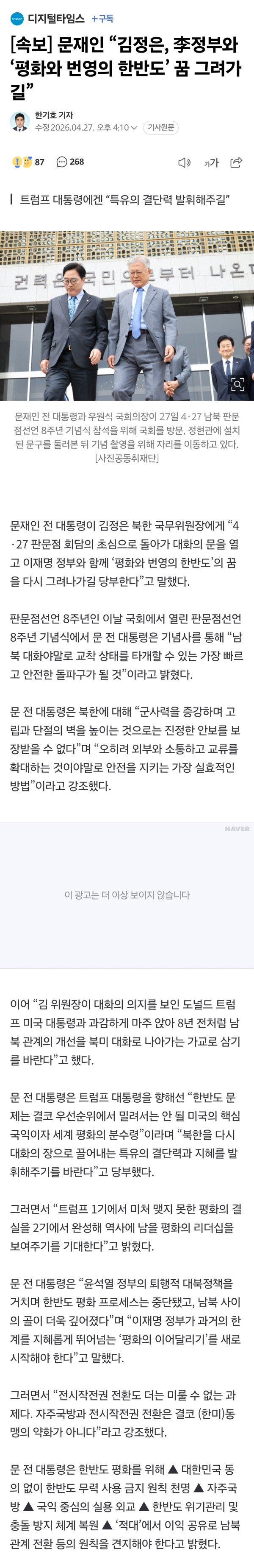 문재인 전 대통령이 김정은 북한 국무위원장에게 “4·27 판문점 회담의 초심으로 돌아가 대화의 문을 열고 이재명 정부와 함께 ‘평화와 번영의 한반도’의 꿈을 다시 그려나가길 당부한다”고 말했다. 판문점선언 8주년인