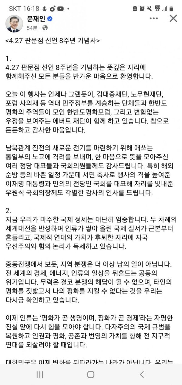 이 선언은 결코 문재인 정부만의 창작물이 아닙니다. 박정희 정부의 7.4 공동성명, 노태우 정부의 남북기본합의서, 김대중 정부의 6.15 공동선언, 노무현 정부의 10.4 정상선언까지, 역대 정부의 성과와 국민의 염원을 하나로 모은 결실입니다.