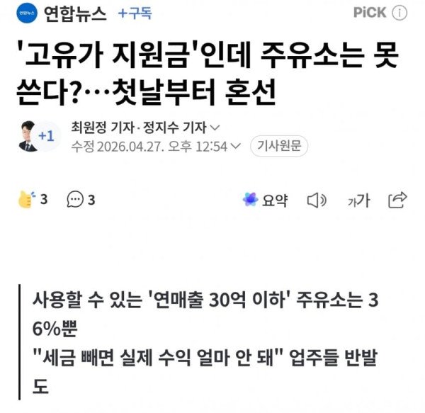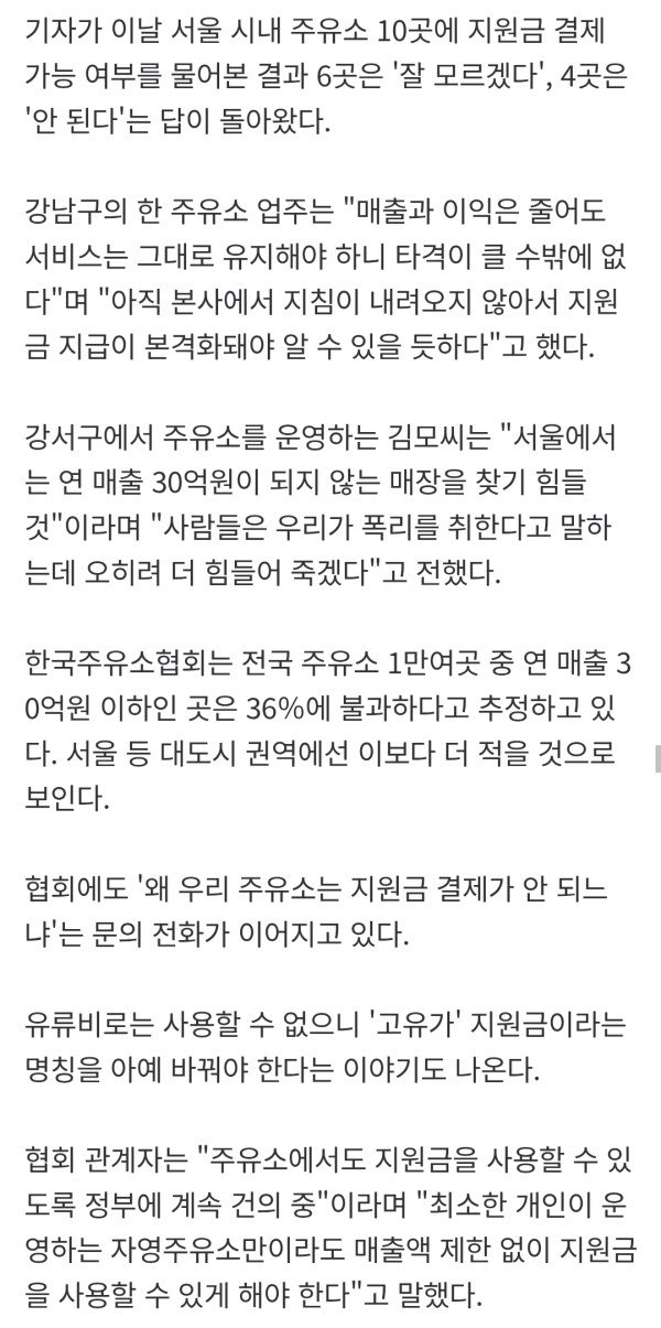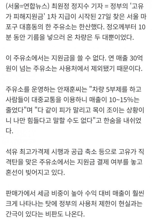 사용할 수 있는 '연매출 30억 이하' 주유소는 36%뿐 "세금 빼면 실제 수익 얼마 안 돼" 업주들 반발도 최원정 정지수 기자 = 정부의 '고유가 피해지원금' 1차 지급이 시작된 27일 찾은 서울 마포구 대흥동의