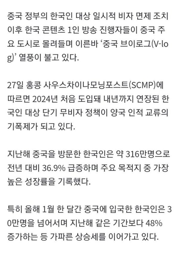 중국 정부의 한국인 대상 일시적 비자 면제 조치 이후 한국 콘텐츠 1인 방송 진행자들이 중국 주요 도시로 몰려들며 이른바 ‘중국 브이로그(V-log)’ 열풍이 불고 있다. 27일 홍콩 사우스차이나모닝포스트(SCMP)