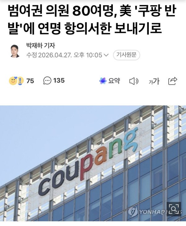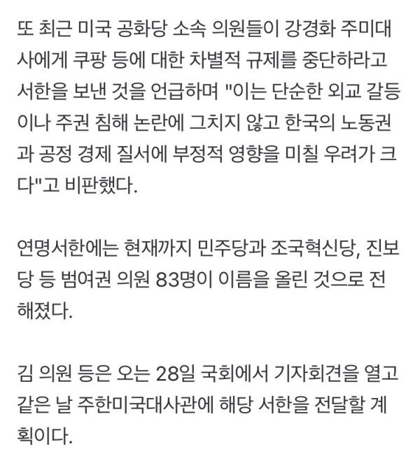 美공화당 의원 54명 "韓, 쿠팡 등 美기업 탄압 중단하라"