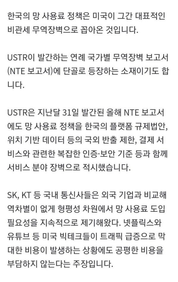 미국 도널드 트럼프 행정부가 한국의 네트워크 사용료(망 사용료) 정책에 대해 다시 한번 불만을 드러냈다. 미 무역대표부(USTR)는 현지 시각 27일 엑스(X·옛 트위터)에 "세계 어떤 나라도 자국의 인터넷 서비스