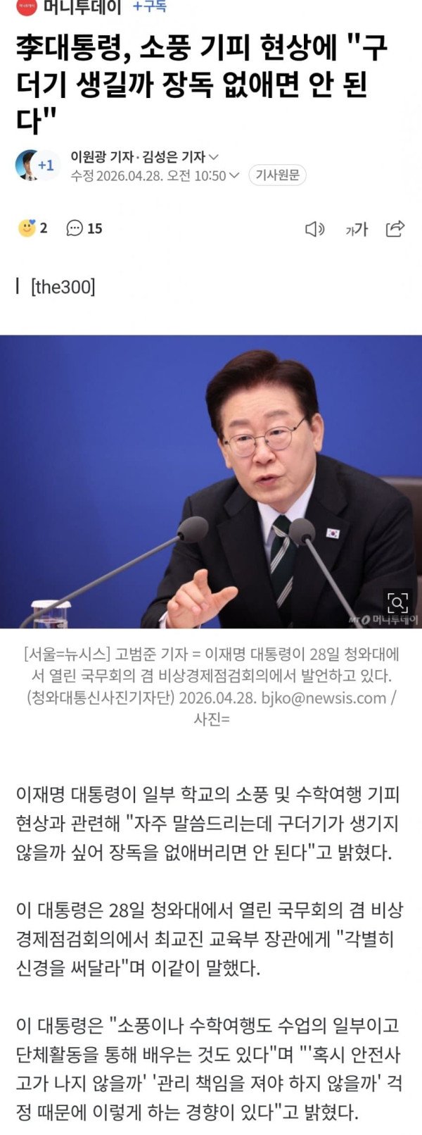 이재명 대통령이 일부 학교의 소풍 및 수학여행 기피 현상과 관련해 "자주 말씀드리는데 구더기가 생기지 않을까 싶어 장독을 없애버리면 안 된다"고 밝혔다. 이 대통령은 28일 청와대에서 열린 국무회의 겸 비상경제점검회