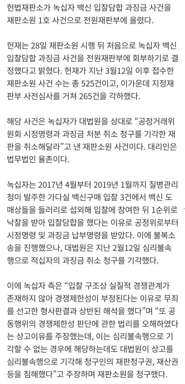 헌법재판소가 녹십자 백신 입찰담합 과징금 사건을 재판소원 1호 사건으로 전원재판부에 올렸다. 헌재는 28일 재판소원 시행 뒤 처음으로 녹십자 백신 입찰담합 과징금 사건을 전원재판부에 회부하기로 결정했다고 밝혔다. 헌