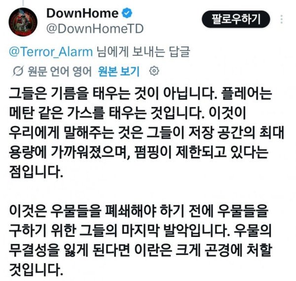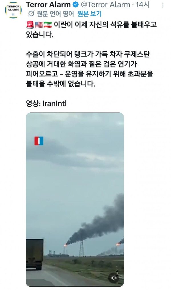 캬 저장 탱크 완전히 꽉차기 전에 메탄 태우노 이제 펌핑 제한 되면 이란 기름 시마이 0배럴 되겠노 ㅋㅋ