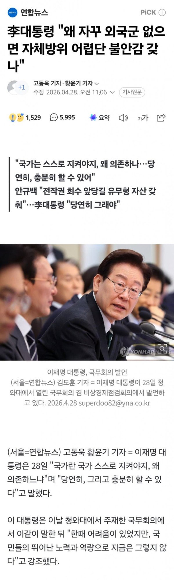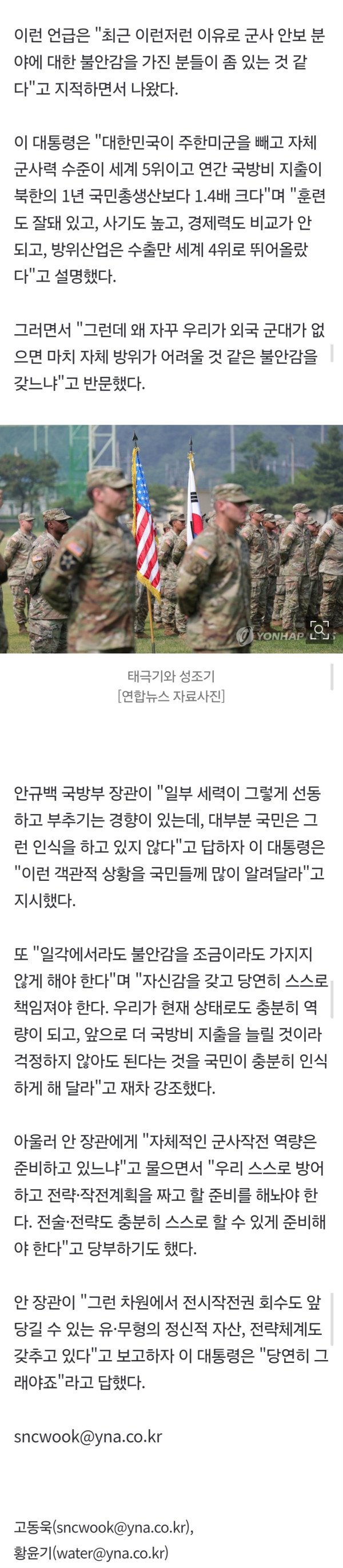 李대통령 "왜 자꾸 외국군 없으면 자체방위 어렵단 불안감 갖나"